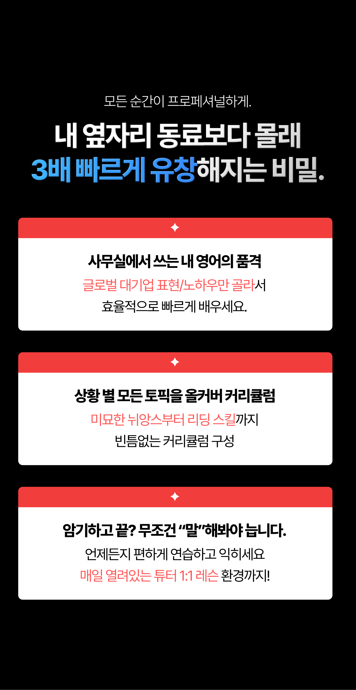 Business Conversation/ 토픽 14개 갈등과 조율·해결 계약·연봉 협상 문제 진단·해결 제시 상대방과 대화 속 가장 미묘한 차이가 필요한 비즈니스 영어 스킬 Business Email/ 토픽 15개 기초·전문성 디테일 구매를 부르는 세일즈 노하우 명확하고 깔끔한 소통의 정석 GPT로 30분씩 걸렸던 메일링 3분만에 프로답게 쓰고 발송하기 Business Meeting/ 토픽 5개 미팅 시작부터 정리까지 명확한 정보 제시·설명 가장 자주 쓰는 문장들로 미팅의 주도권을 확실하게 잡아줄 비즈니스 미팅 Interview/ 토픽 4개 자기소개·첫인상 역량 중심 질문 답변 글로벌 대기업이 탐내는 인재로임팩트 있는 면접자가 되도록자신있게, 구조 있게 답하기 Business Call/ 토픽 5개 정중한 논의 요청 갈등 조율·합의점 돌발상황부터 프로다운 거절까지 비즈니스 콜의 모든 상황을 케이스 별로 완벽 정복 Presentation/ 토픽 3개 발표 시작·마무리 유연한 질문 대응 발표 시작부터 피드백 대응까지 핵심 정리로 깔끔한 PT발표 마무리를 한번에 해결 전체 커리큘럼 목차 자세히 보기 Business Conversation 목차 Price Negotiations 가격 협상 깔끔하게 하기 Contract Negotiations 계약 조건 조율하고 합의 도출하기 Salary Negotiations 연봉 협상하기 Handling Objections in Sales 거래처의 반론에 대응하며 설득하기 Giving and Receving Feedback 팀원 성과 피드백 주고 받기 Dealing with Negative Feedback 팀원에게 개선사항 효과적으로 전달하기 Identifying and Managing Conflict 갈등을 파악하고 조율하며 해결하기 Problem-solving 문제를 진단하고 해결책 제시하기 Motivating and Encouraging Teams 팀원들 동기부여하기 Brainstorming 브레인스토밍 미팅하기 Networking 처음 만난 사람과 관계 만들기 Elevator Pitch 짧고 강력한 자기소개, 엘리베이터 피치 Following Up After a Networking Event 네트워킹 후 자연스럽게 후속 연락하기 Resigning From a Position 프로답고 정중하게 퇴사 통보하기 Business Email 목차 Effective Communication 명확하고 효과적으로 소통하는 이메일 쓰기 Emailing a Proposal 제안서 이메일로 전문성 있게 전달하기 Responding to Emails 이메일에 적절히 응답하고 소통 이어가기 Writing Emails to Clients 클라이언트에게 신규 서비스 소개하기 Writing Emails to Colleagues 동료에게 데드라인 딜레이 사과메일쓰기 Emails for Making Suggestions 아이디어나 제안을 메일로 자연스럽게 전하기 Responding to Suggestions 제안에 응답하고 의견 나누기 Emailing for Job Applications 입사 지원 메일을 포멀하고 매력 있게 쓰기 Following up on Job Applications 입사 지원 후 정중히 응답하기 Emailing for Sales 제품 가치를 어필하는 세일즈 이메일 Following up on Sales 후속 세일즈 메일로 구매 유도하기 Emailing for Customer Service 고객 문의에 응답하고 문제 해결하기 Following up on Customer Service 정중한 고객 서비스 후속 대응하기 Emailing for Marketing 마케팅용 이메일로 관심 유도하기 Following up on Marketing 후속 마케팅 메일로 반응 끌어내기 Business Call 목차 Making & Responding to Requests 정중하게 논의 요청하고 프로답게 거절하기 Giving and Receiving Feedback 의견 나누고 피드백 주고받기 Dealing with Technical Issues 통화 마이크&인터넷 연결 문제 해결하기 Negotiating and Resolving Conflicts 갈등을 조율하고 합의점 찾기 Closing Remarks and Follow-up 대화 마무리하고 자연스럽게 이어가기 BusinessMeeting 목차 Preparing for a Meeting 회의 준비하고 일정 조율하기 Starting a Meeting 회의 시작하고 분위기 잡기 Presenting Information 정보를 명확하게 제시하고 설명하기 Negotiating 의견 조율하고 협상 이끌기 Concluding a Meeting 회의 정리하고 다음 단계 제시하기 Presentation 목차 Introductions 발표 시작하고 흐름 잡기 Dealing with Questions and Feedback 질문과 피드백에 유연하게 대응하기 Concluding the Presentation 핵심을 정리하며 깔끔하게 마무리하기 Interview 목차 Introductions 나를 소개하고 첫인상 만들기 Competency-based Interview Questions 역량 중심 질문에 구조 있게 답하기 Common Interview Questions 자주 나오는 질문에 자신 있게 말하기 Making a Good Impression 임팩트있는 면접자되기